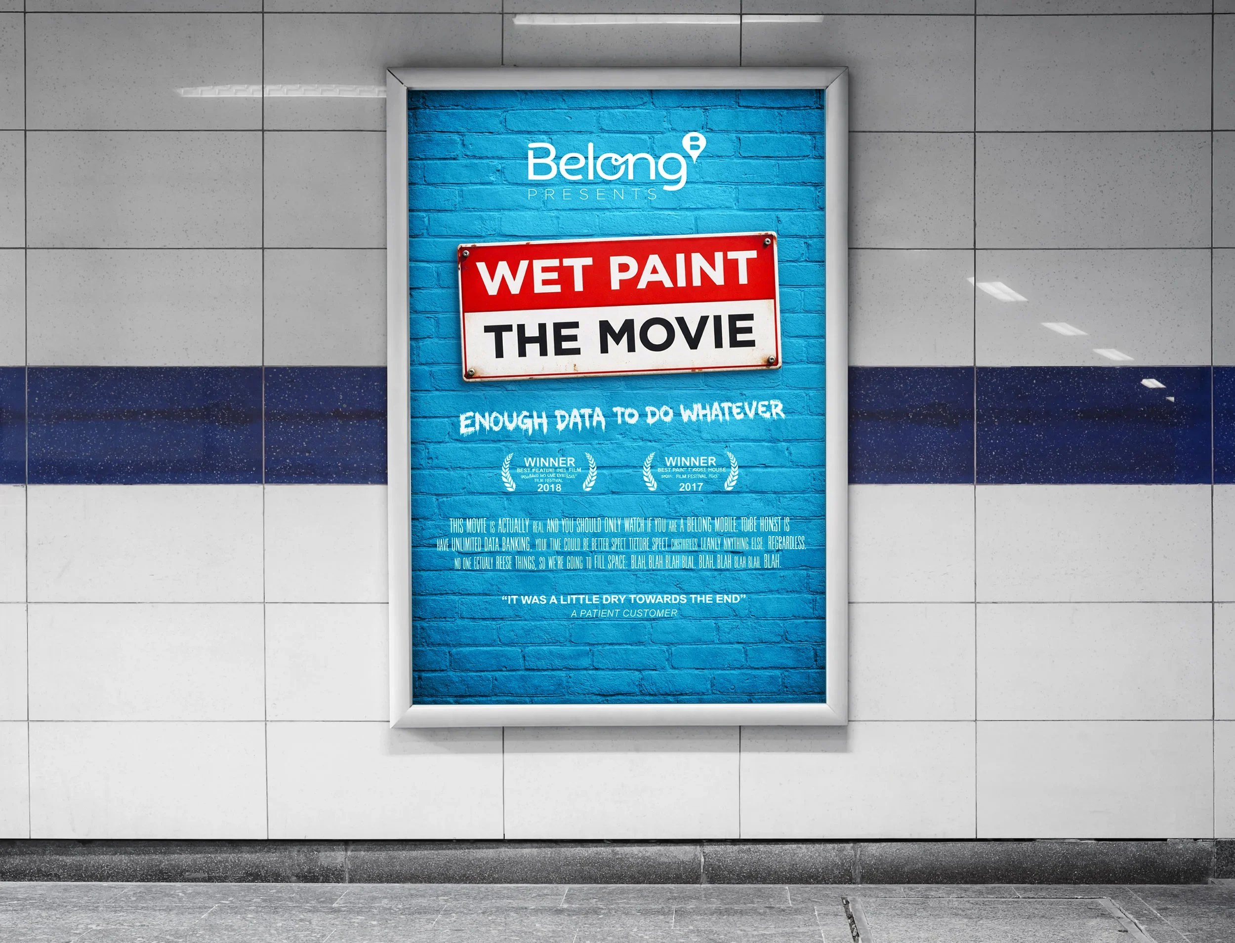 To promote Belong’s Unlimited Data offer, we wanted to show viewers what you could potentially spend your unlimited data on. With next to no budget, we wrote, directed and produced the world's longest (5hrs) and most pointless Youtube pre-roll commercial, made for those who have enough data to do whatever. Critics were saying: “Wet Paint covers a lot of areas” - “You won't believe the twist. A stroke of genius.” - “A timeless tale.” - “Walks a fine line between art and absurdity, but It was a little dry towards the end.”
